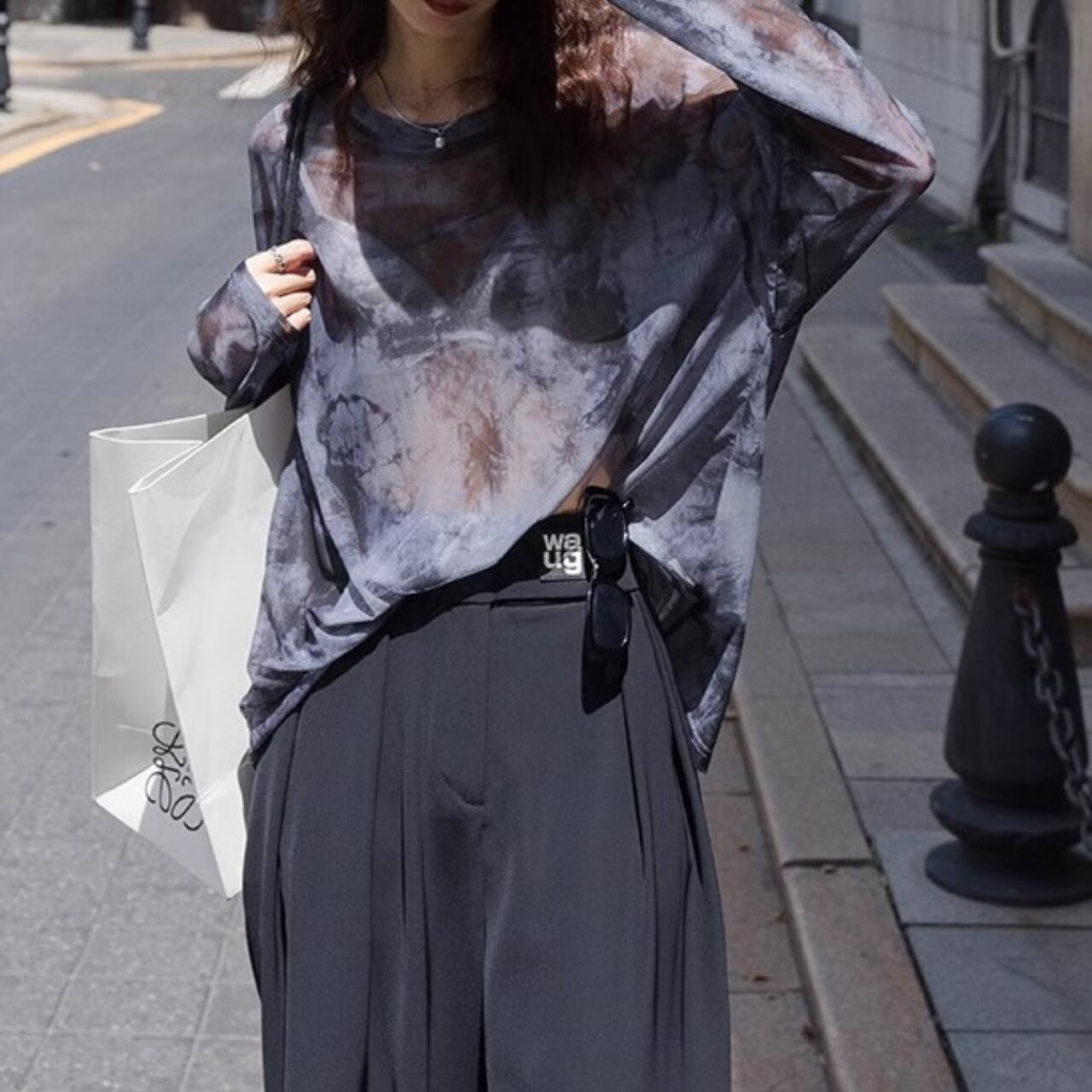 透け感のある素材に抽象プリントを入れたシアーカットソー。