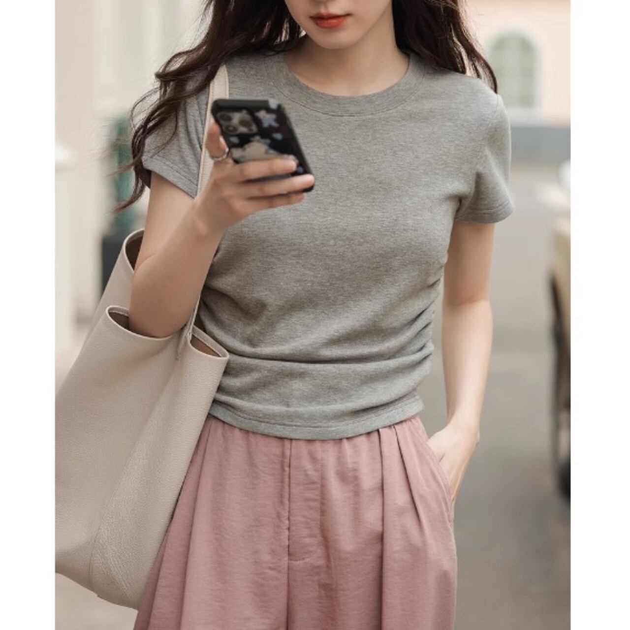 サイドのギャザーがポイントのトレンド感のあるTシャツ。