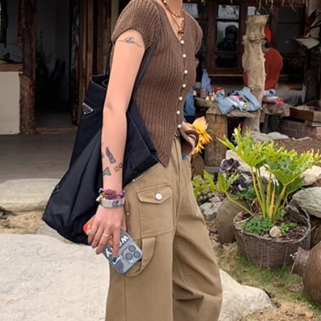 パールボタンがアクセントの、ざっくりラフな雰囲気の半袖ニットカットソー。