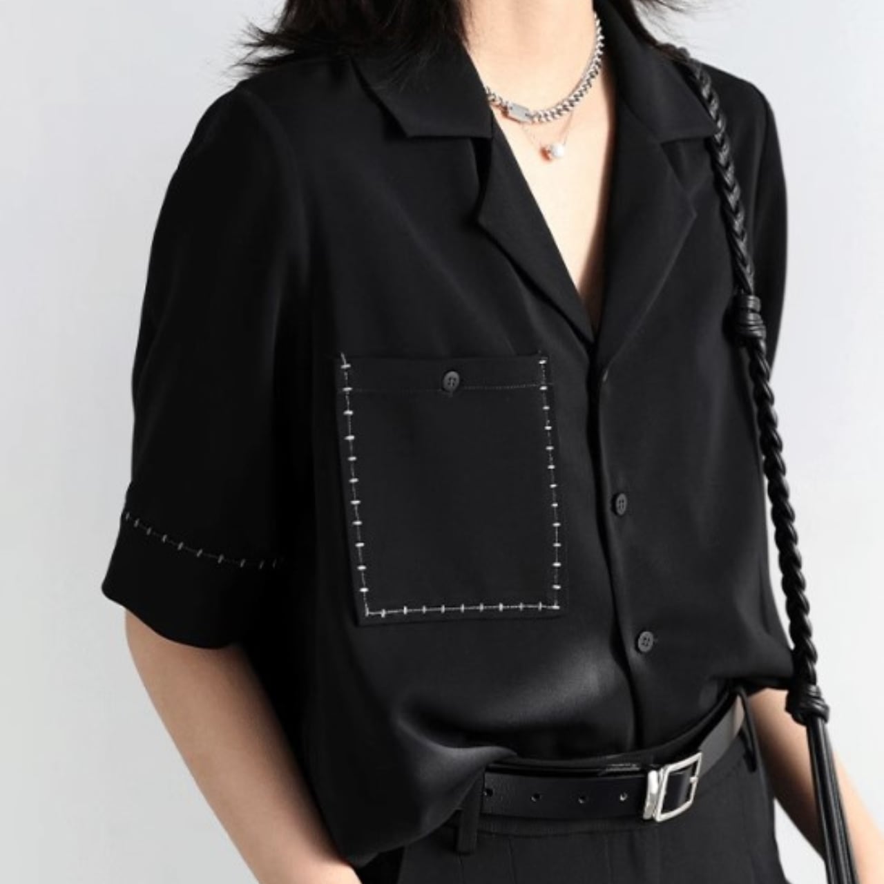 袖口やポケットのステッチデザインがポイントの、一癖あるスムースドレープシャツ。